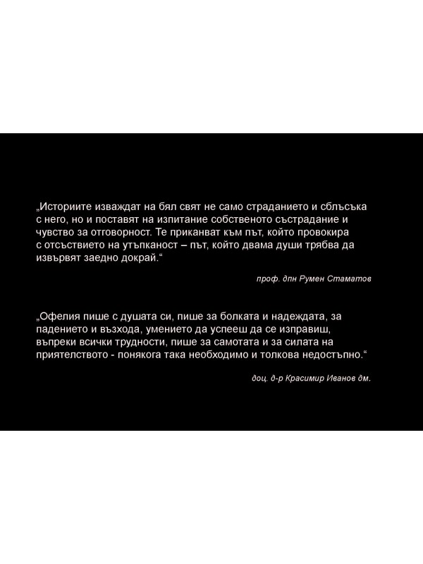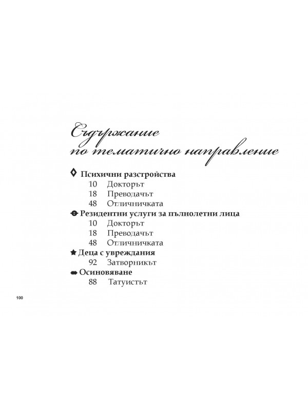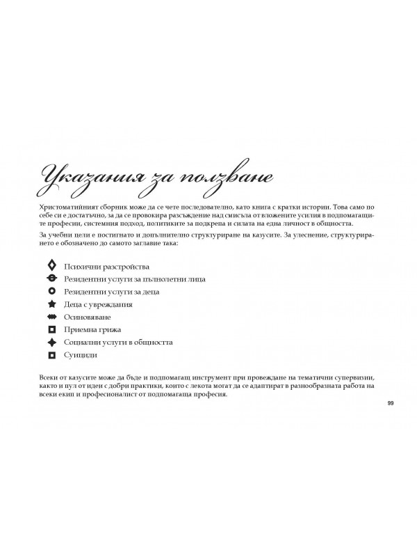 Този сборник с разкази всъщност е христоматия за студенти, изучаващи хуманитарни науки и усвояващи подпомагащи професии. Всеки откъс е базиран на истинска история от България. Всеки разказ представя професионален казус с преплитане на фактология, хипотези, препятствия и решения. Въздействието на думите цели да провокира анализ на истинското послание от кратката история, което е оставено в междуредията за размисъл и е основа за академична и приложна дейност.